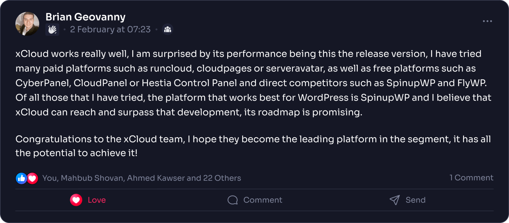 xCloud works really well, I am surprised by its performance being this the release version, I have tried many paid platforms such as runcloud, cloudpages or serveravatar, as well as free platforms such as CyberPanel, CloudPanel or Hestia Control Panel and direct competitors such as SpinupWP and FlyWP. Of all those that I have tried, the platform that works best for WordPress is SpinupWP and I believe that xCloud can reach and surpass that development, its roadmap is promising.