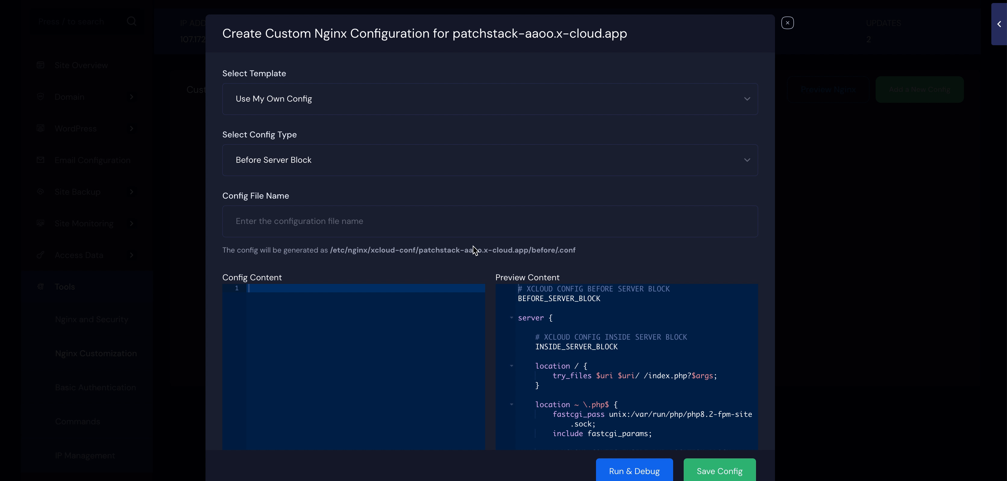 - If you choose the โBefore Server Blockโ and set a Config File Name, the Config will be generated as /etc/NGINX/xcloud-conf/(sitename)/before/(Config File Name).