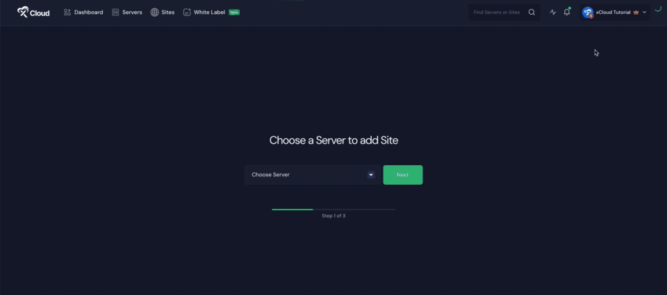 Log in to your xCloud dashboard and click the ‘+New Site’ to add a new site. Then, choose a server from the list and go to ‘Next’.