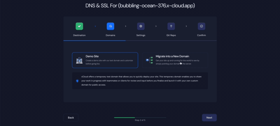From the ‘Domains’ tab, you will get two options: either you can create a ‘Demo Site’ with a test domain and refine it until it is ready for launch, or, you can migrate into a new domain to get your site up and running in a new domain.