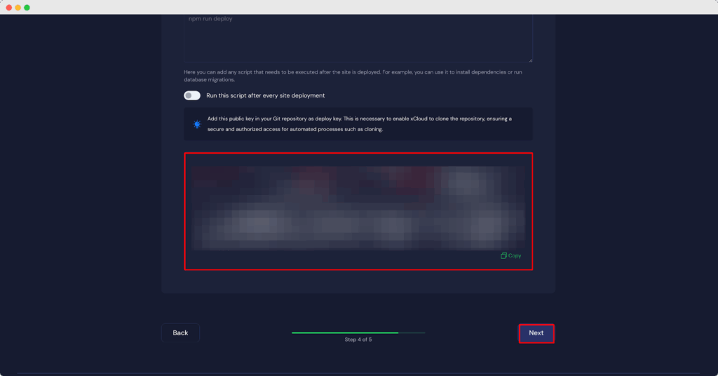 After inserting the deploy key in GitHub, click on ‘Next’ on your xCloud settings of the ‘Git Repo’ tab.