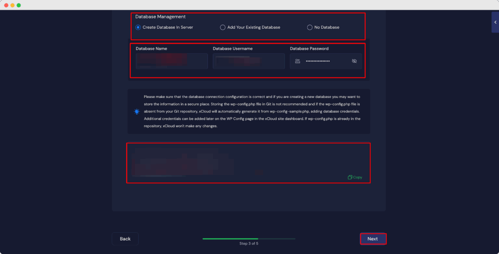 If you select this option, enter your ‘Database Name’, ‘Database Username’ and ‘Database Password’. You can keep these auto-generated credentials, or you can modify them according to your choice.