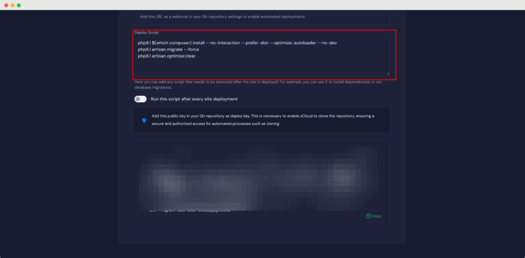From the xCloud dashboard, copy the ‘Public Key’ to add it to your Git repository as a deploy key. Git migration uses the ‘Public Key’ for SSH authentication. This is necessary to enable xCloud to access your Git repository and clone it. It ensures secure and authorized access for the cloning process.
