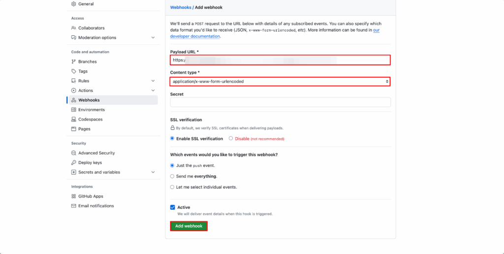 Note: This step is optional. Adding a webhook enables automatic deployments when you push changes to the repository, but it’s not required if you prefer to deploy manually.