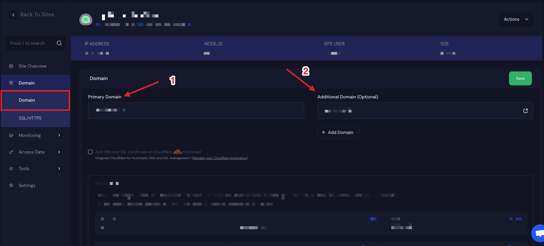 You can add your own domain to host the site by going to the Domain section. Also, you can add an Additional Domain to host the status page of Uptime Kuma with your custom domain.