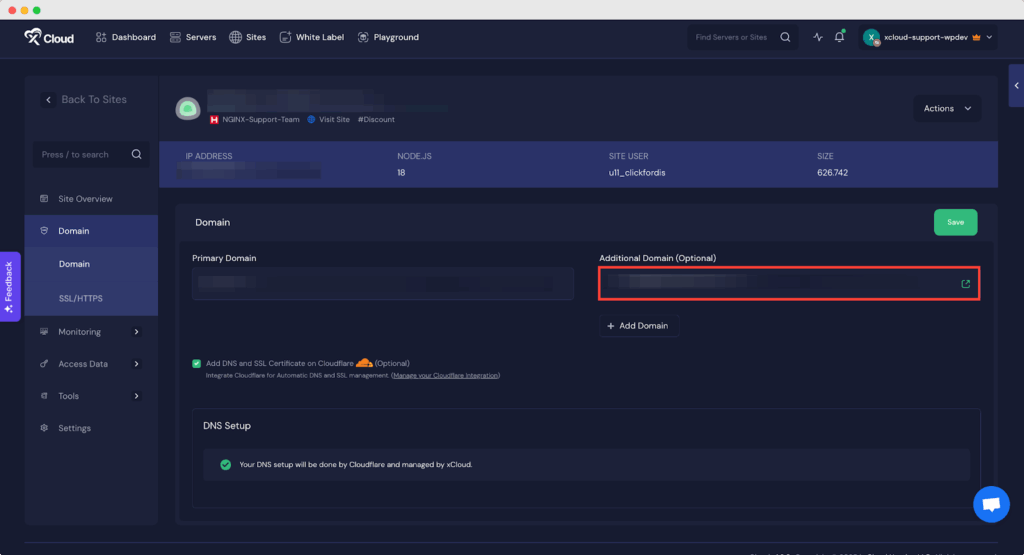 Next, go back to your Uptime Kuma site dashboard in xCloud. You can add your status pageโs URL as an additional domain here. Just go to the โDomainโ and add the URL into the โAdditional Domainโ and click on the save button.