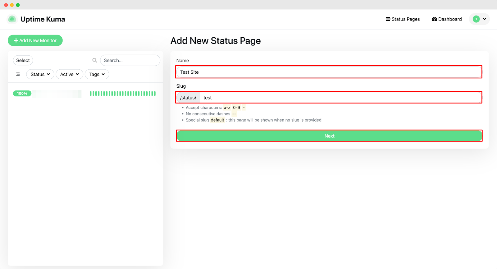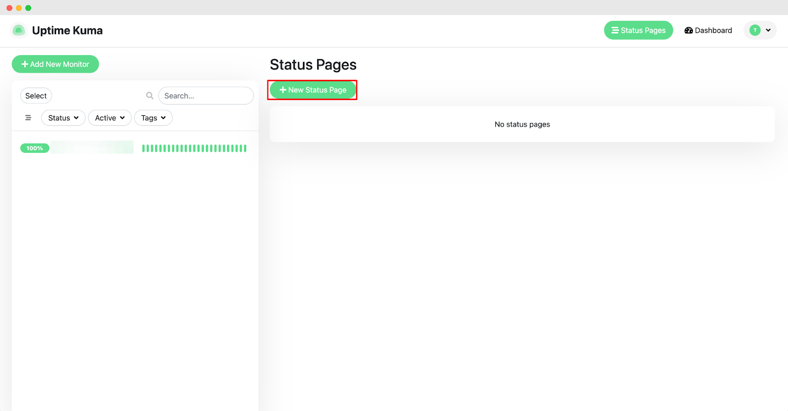 In the Uptime Kuma dashboard, locate the “Status Page” option in the navigation menu and click on it to get started. Click the โCreate New Status Pageโ button.