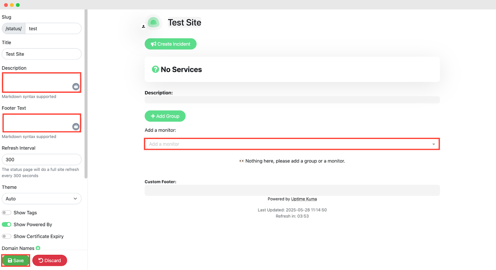 To display service statuses, click โAdd Monitorโ and choose which services or sites you want this page to track. These will appear on the public page as live status indicators.