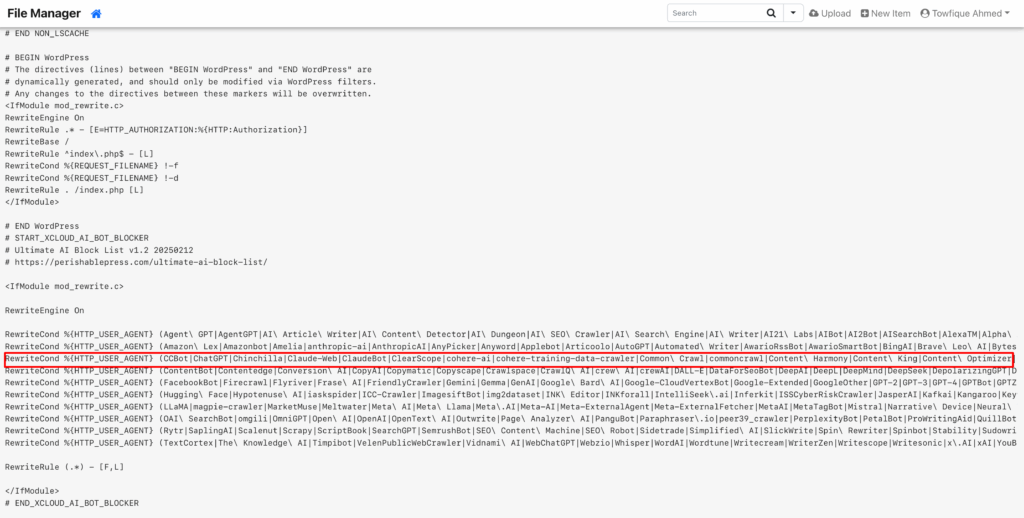 You can easily exclude a specific bot from your OLS server by editing the ‘.htaccess‘ file. To do this, go to your File Manager and locate the ‘.htaccess‘ file. Click on the ‘Edit’ button to open it. Within the file, remove the specific bot you want to exclude. Once you’ve made the changes, click ‘Save’ to apply them. This will effectively prevent the specified bot from accessing your server.