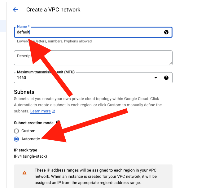 If the project does not show any default VPC network, then you can create a new VPC network by yourself. To create a new VPC network, look for the โCreate VPC Networkโ and click on it. Now a form will pop up on the screen. Here, you need to fill up the form, give it a name set the โSubnet creation modeโ to automatic and forward with the โCreateโ button so that you can create a new VPC network.