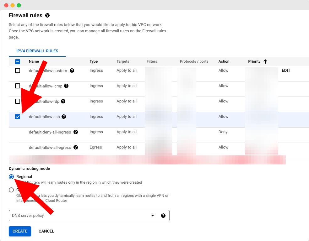 Once the VPC network is created, you can manage all firewall rules on the Firewall rules page. Select any firewall rules below that you would like to apply to this VPC network from the below menu. Then roll down to the next section where you will set the Dynamic routing mode to โRegionalโ and press on the โCreateโ button.
