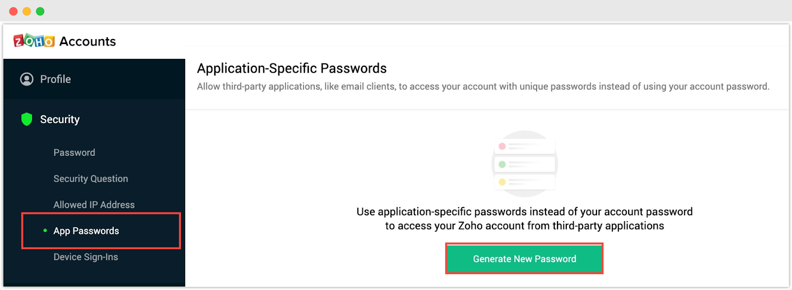 Log in to your Zoho Mail account. Navigate to My Account โ†’  Security โ†’ App Passwords. Generate a new application-specific password for use with external applications like FluentSMTP.