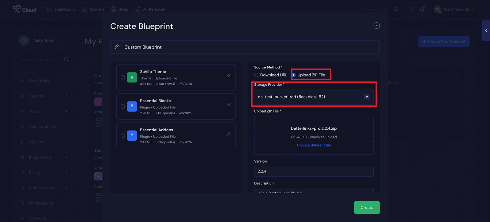 If you have uploaded a plugin, you need to choose at least one theme to create this blueprint. Alternatively, if you uploaded a theme, you need to choose at least one plugin to create this blueprint. From here, go to the โ€˜Available Custom Itemsโ€™ section and choose a theme or plugin that you have already uploaded. Then click on the โ€˜Createโ€™ button.