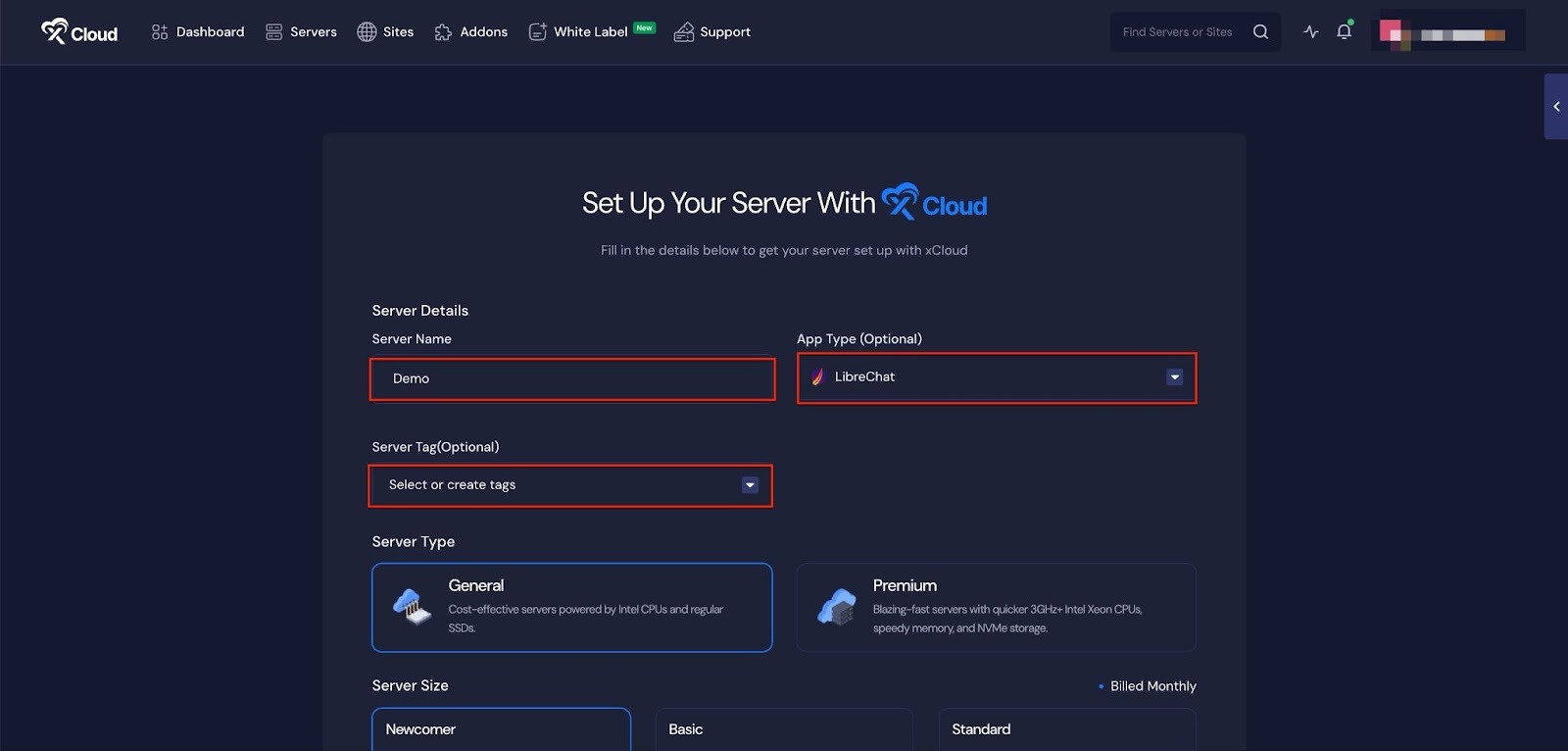 Afterward, enter the โ€˜Server Nameโ€™, set the โ€˜App Typeโ€™ to LibreChat, and add any relevant โ€˜Tagsโ€™ to help identify your server later.ย