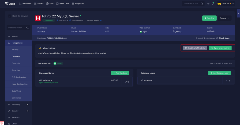 You can also disable it by clicking โDisable phpMyAdminโ. Additionally, you can create a new database or database user for that server directly from the dashboard.