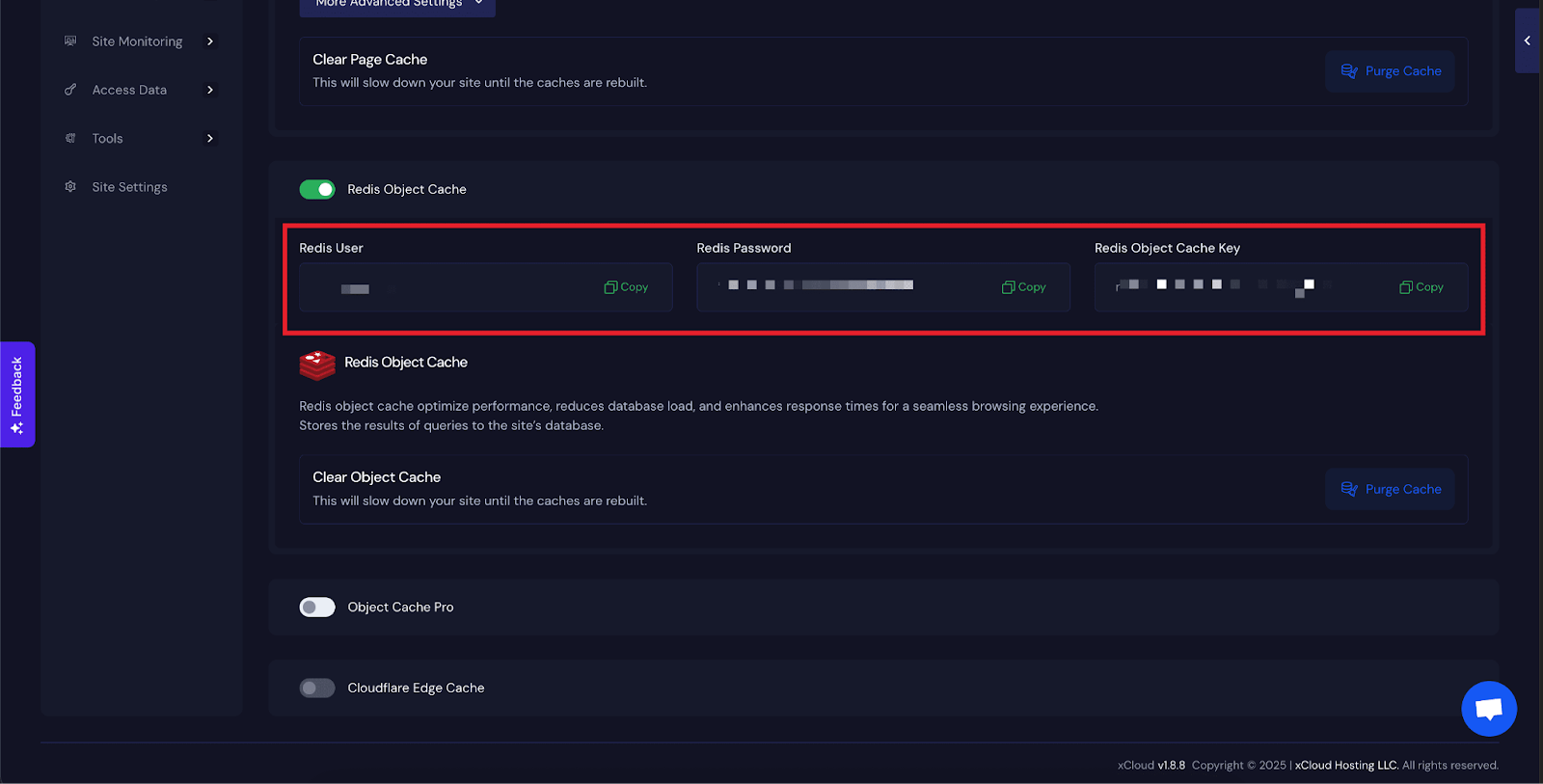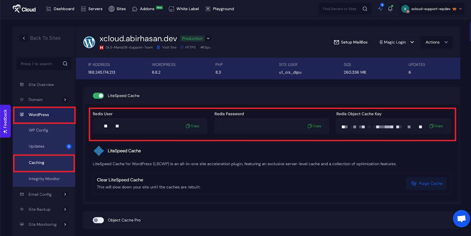 Here, can see the Redis credentials such as โ€˜Redis Userโ€™, โ€˜Redis Passwordโ€™ and โ€˜Redis Object Cache Keyโ€™ options.ย ย