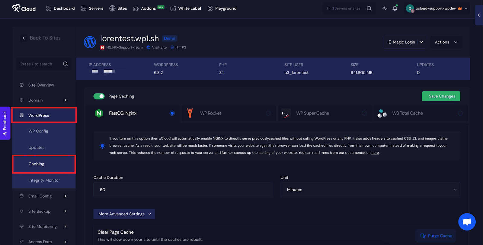 To find the Redis credentials, go to the โ€˜Siteโ€™ and head over to the Caching option from the left navigation bar.ย  For the NGINX servers, go to the โ€˜WordPressโ€™ โ†’ โ€˜Cachingโ€™ option.ย