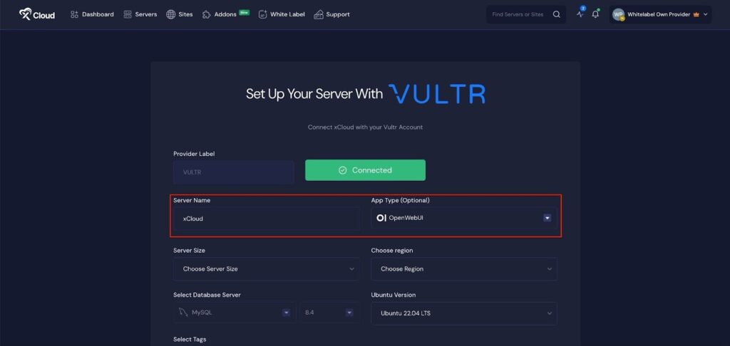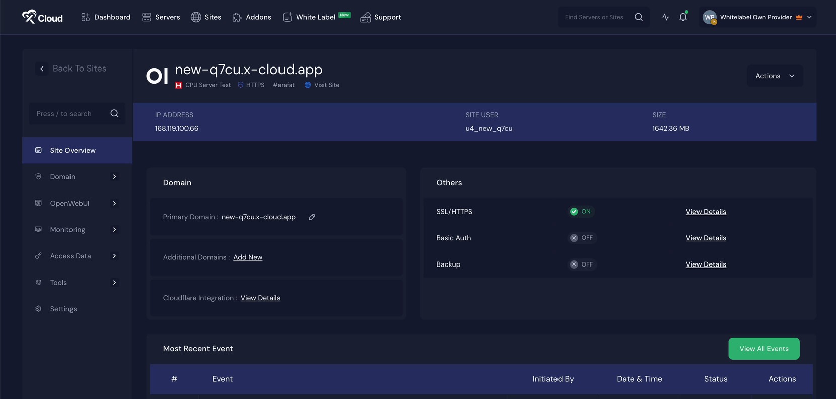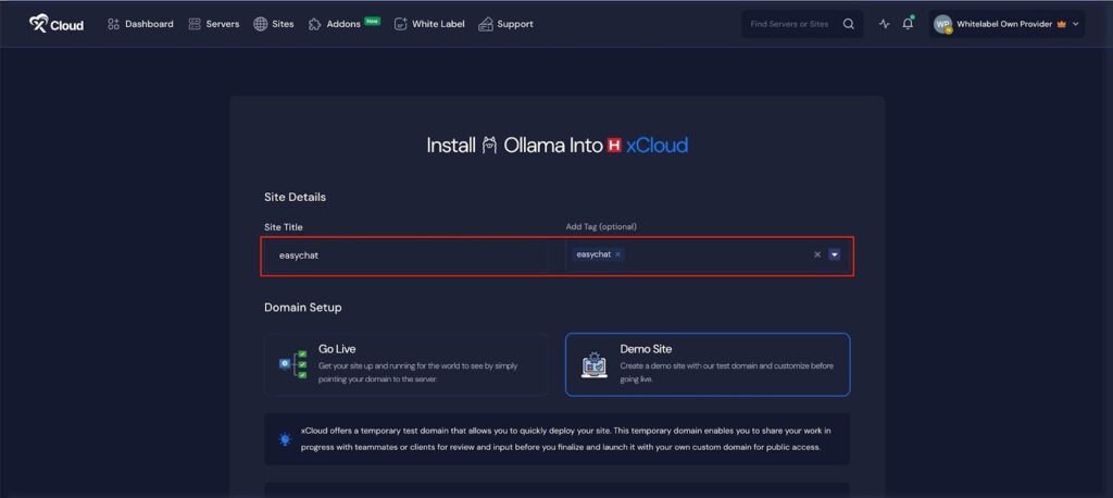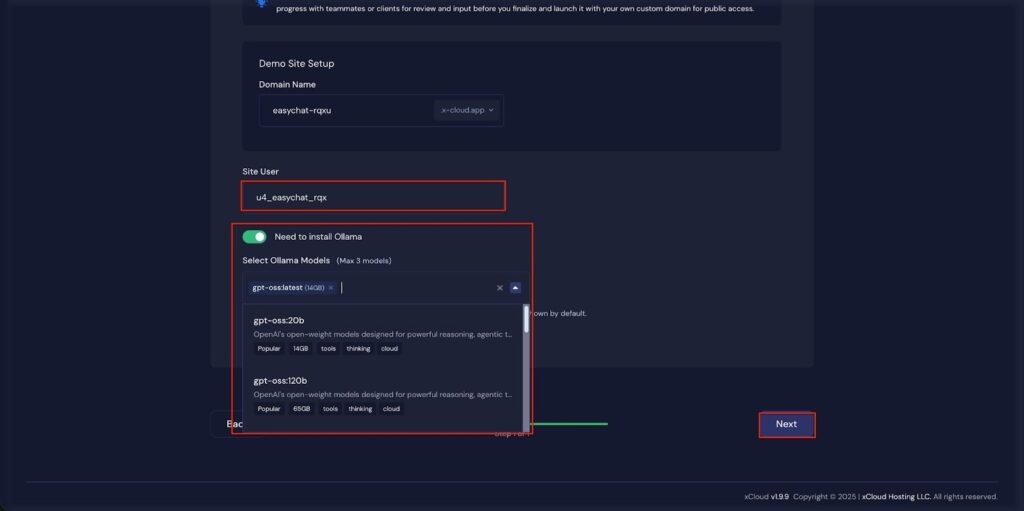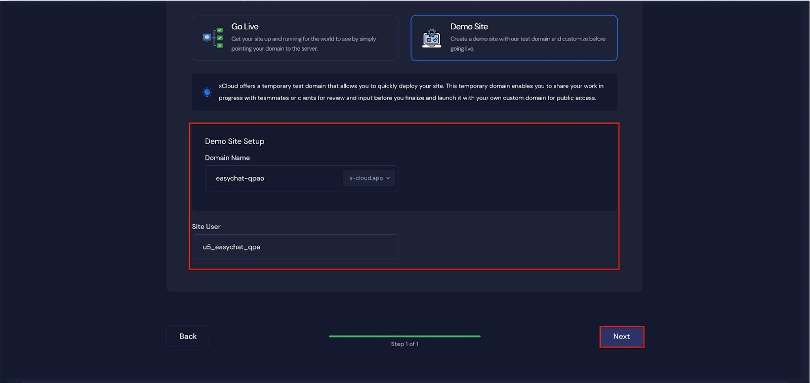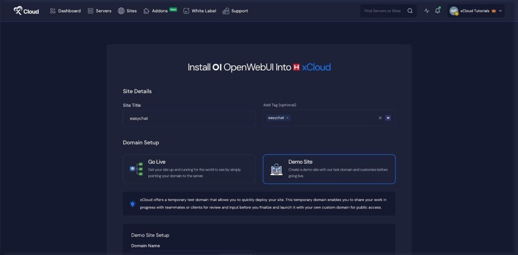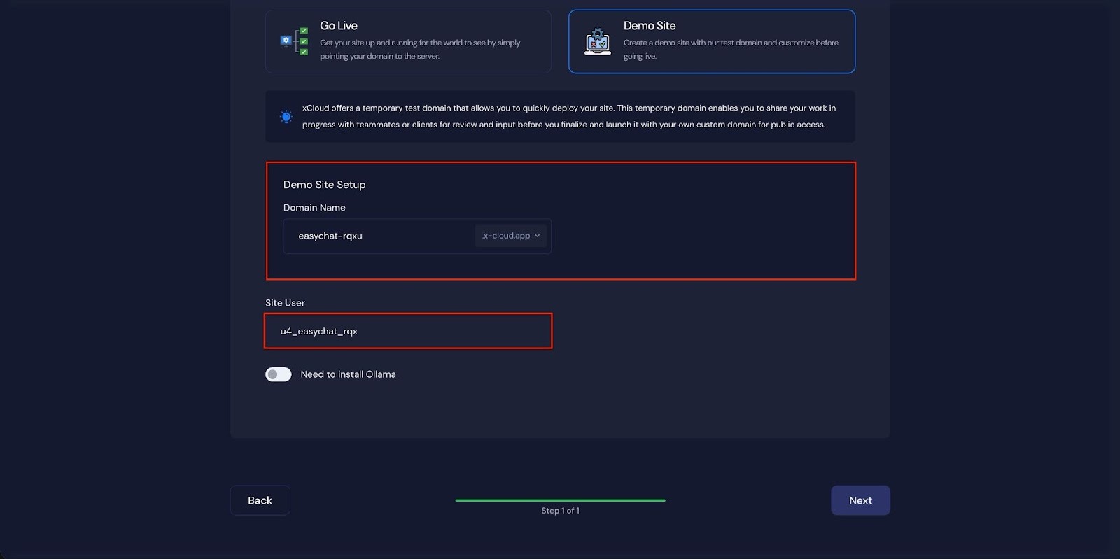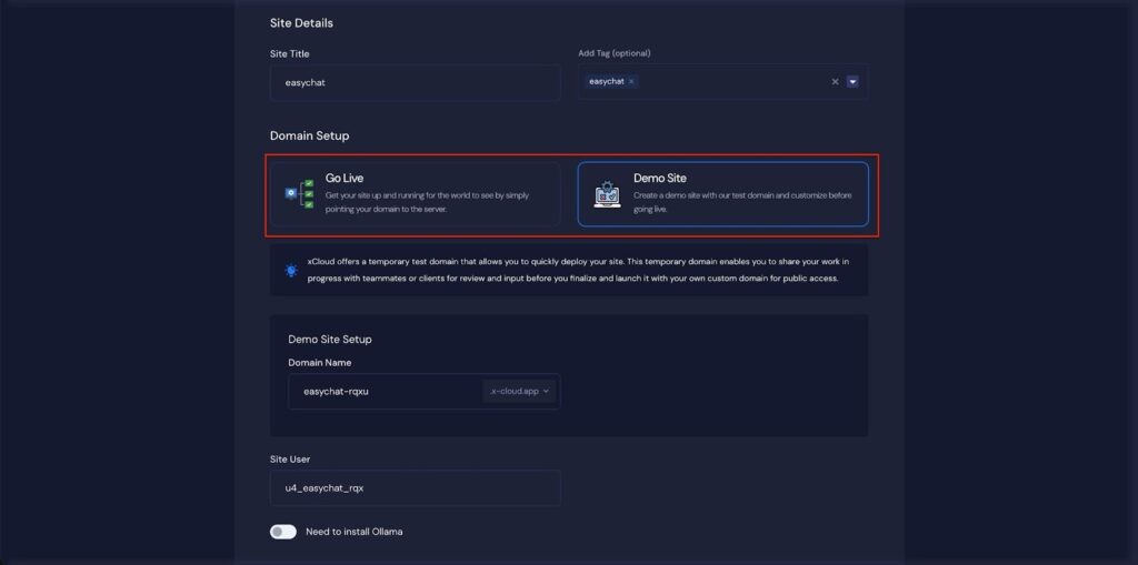If you select the ‘Demo Site’ option, xCloud will assign a temporary subdomain for your OpenWebUI application. You can adjust the ‘Site User’ according to your preferences, or leave it as the default.