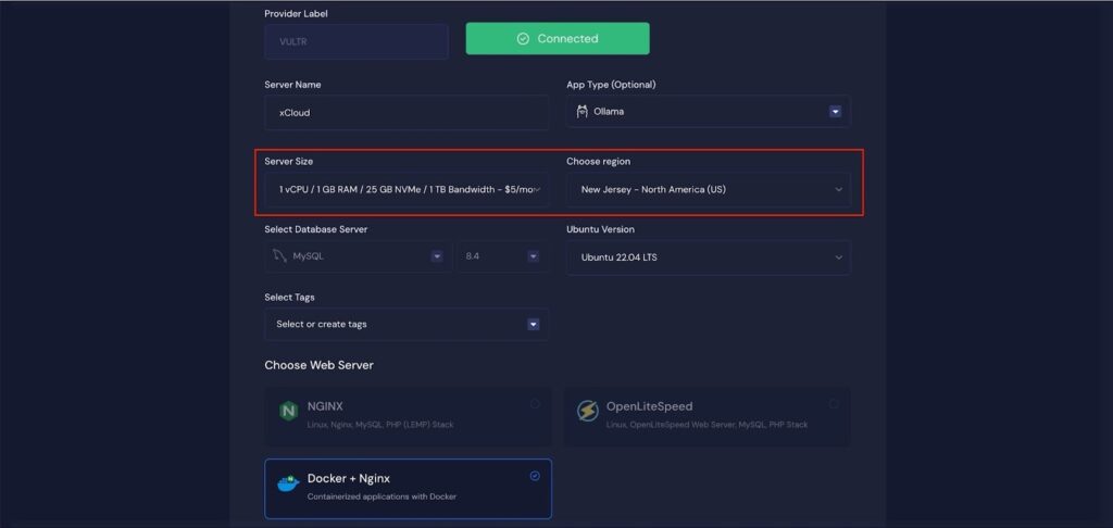 Once the server is created, you will be able to deploy your OLLAMA Application in this server.
