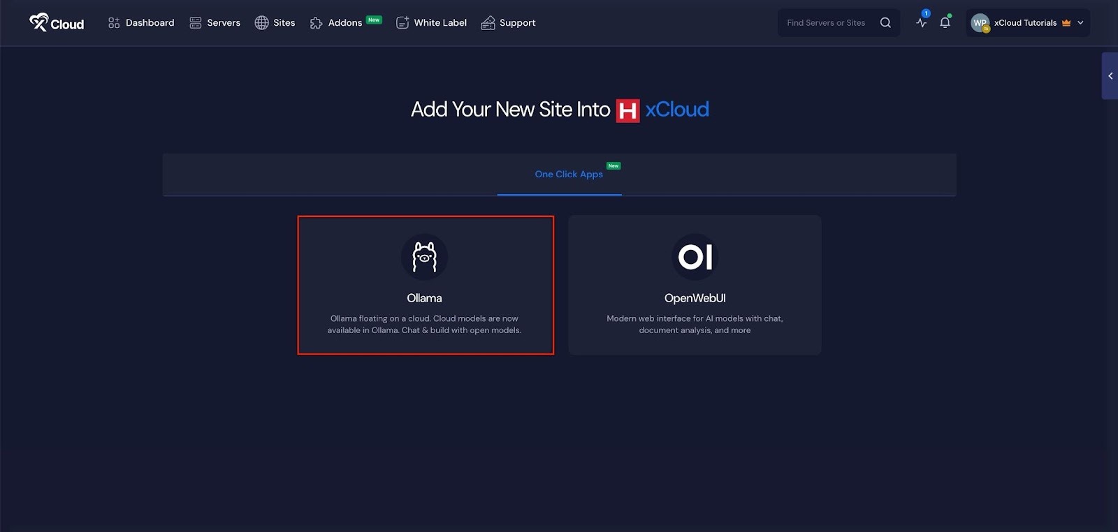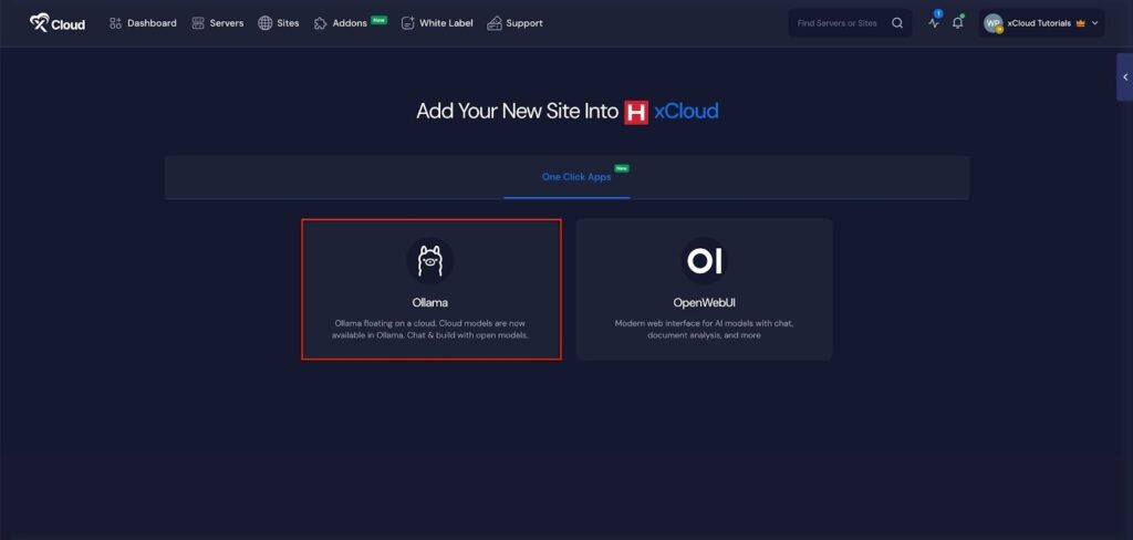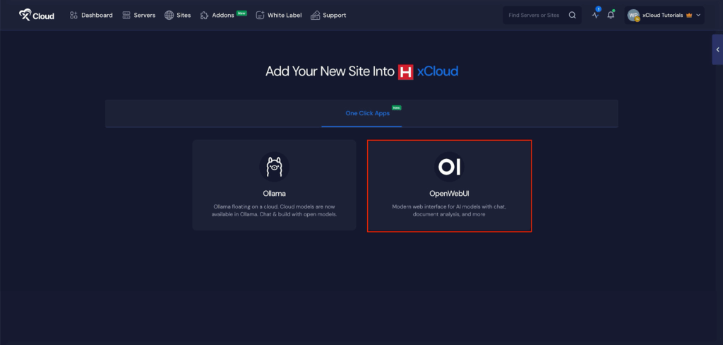 This will take you to the Site Creation Interface. From here, choose your Server, then go to the One-Click Apps section. You will see two options ‘OpenWebUI’ and ‘Ollama’. Choose ‘OpenWebUI’ to begin deploying the application.