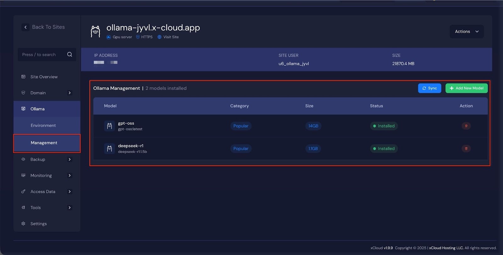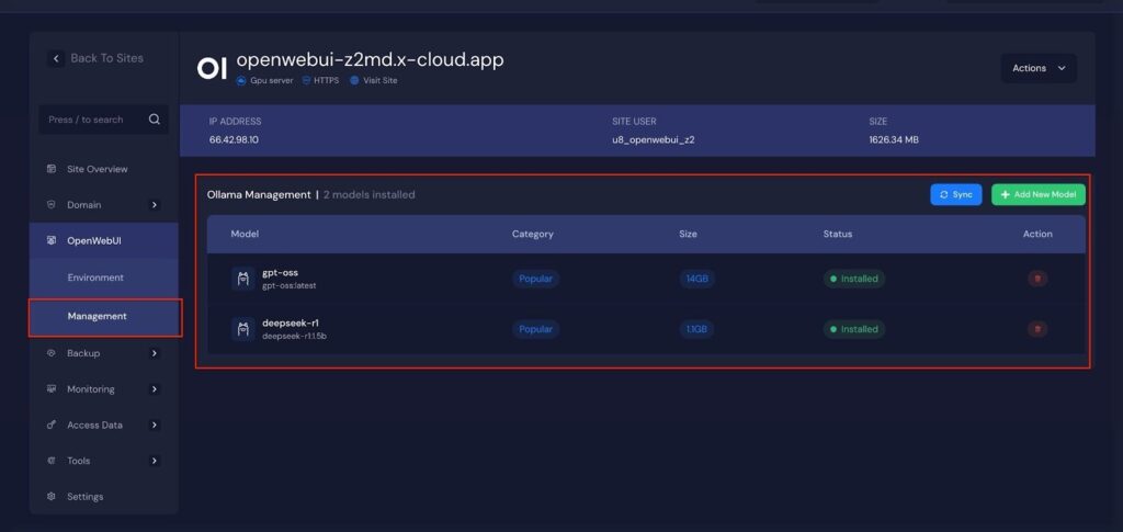 Later, you can manage your OpenWebUI application. Go to the ‘OpenWebUI’ → ‘Management’. Next, click on the ‘Add New Model’ to install more AI models. Also, you can click on the ‘Delete Icon’ to delete the AI models of this application.