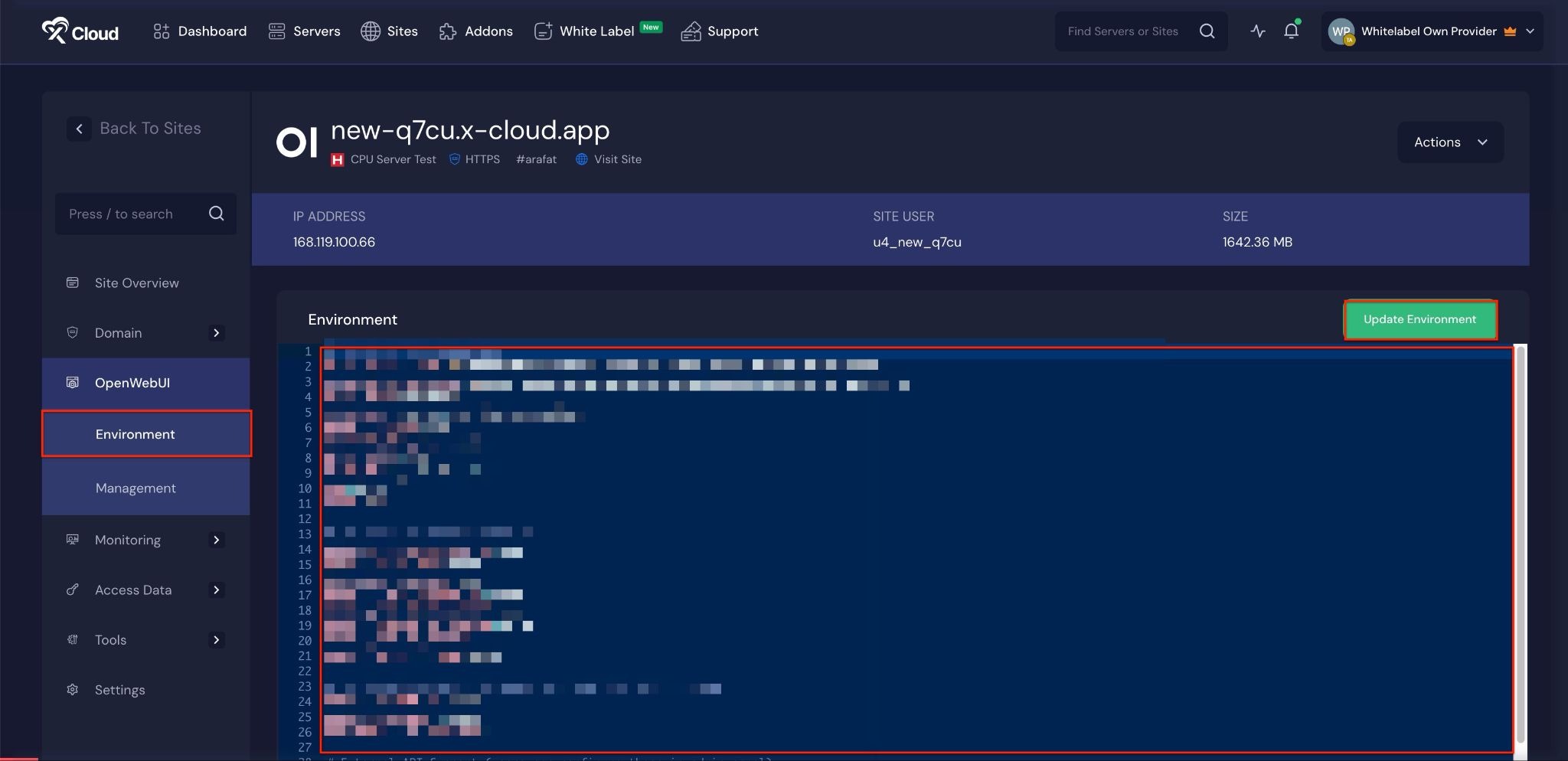 The Environment section in xCloud allows you to customize configuration settings for your OpenWebUI instance. Just go to the ‘Environment’ option from the sidebar and adjust as you need, then click on the ‘Save’ button.