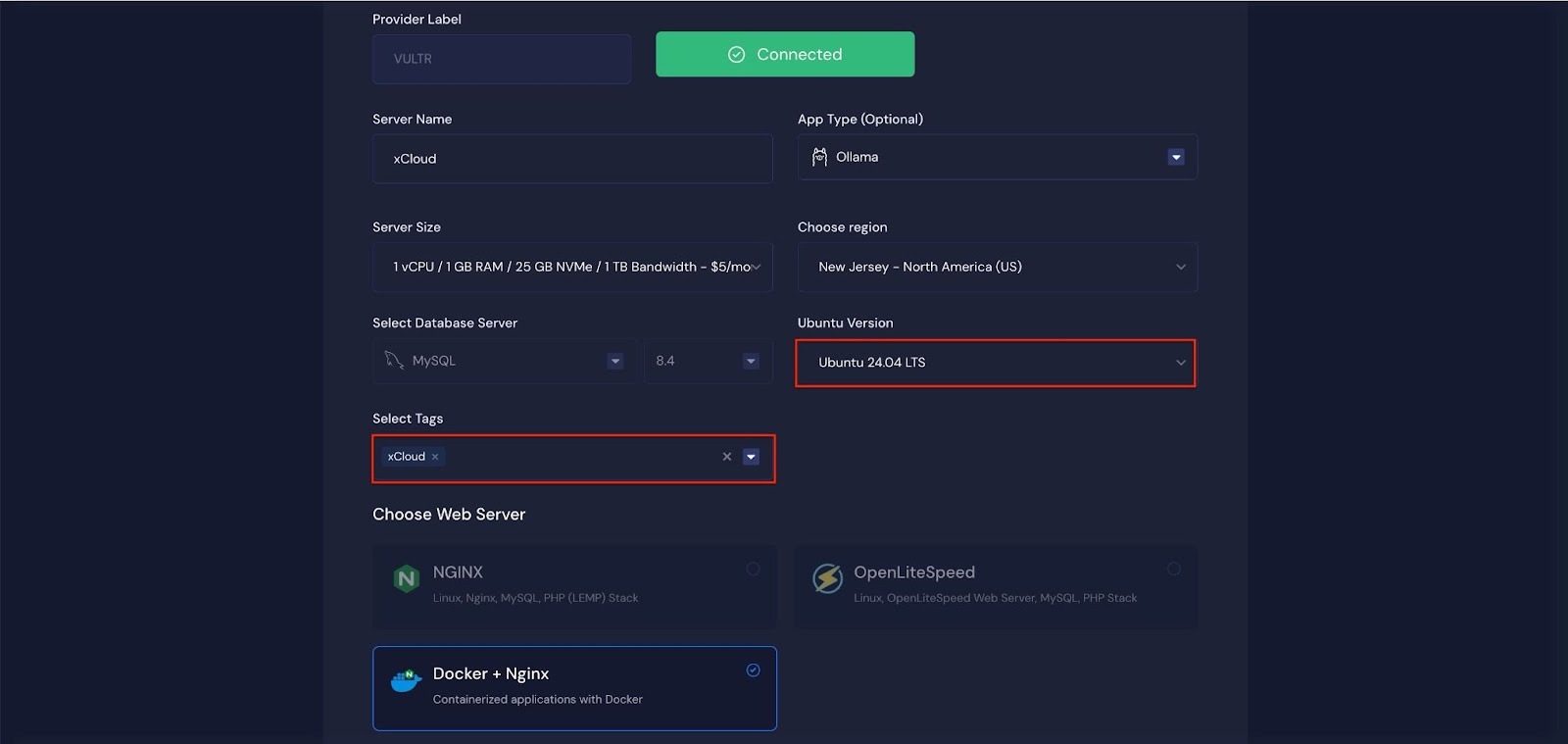 First, you need to create a server to deploy any LLMs. Click on the ‘Add New Server’ button from the dashboard and enter all the credentials required to connect your server. You can deploy Ollama on your own server or on an xCloud server.