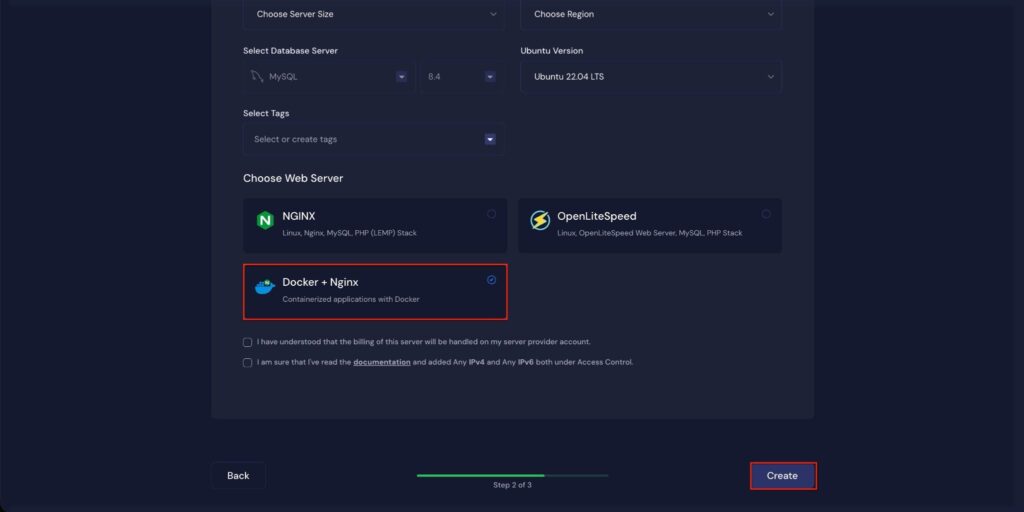 Next, you can see the ‘Docker + NGINX’ stack is already selected, which is mandatory for deploy the LLM application.