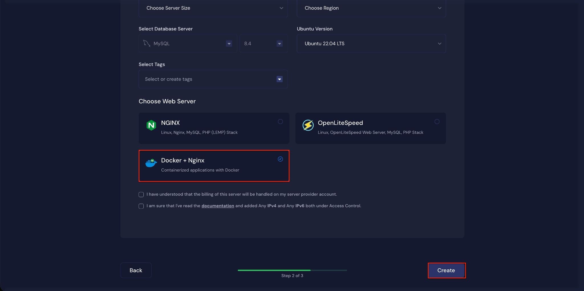 Then choose a ‘Server Size’ and ‘Region’ of the server according to your preferences.