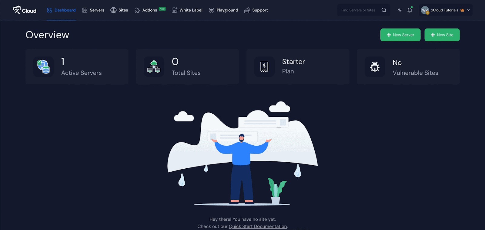 Begin by logging into your xCloud account. Once logged in, navigate to your dashboard and click on the ‘New Site’ button. Then choose your server and click on the ‘Next’ button to proceed.