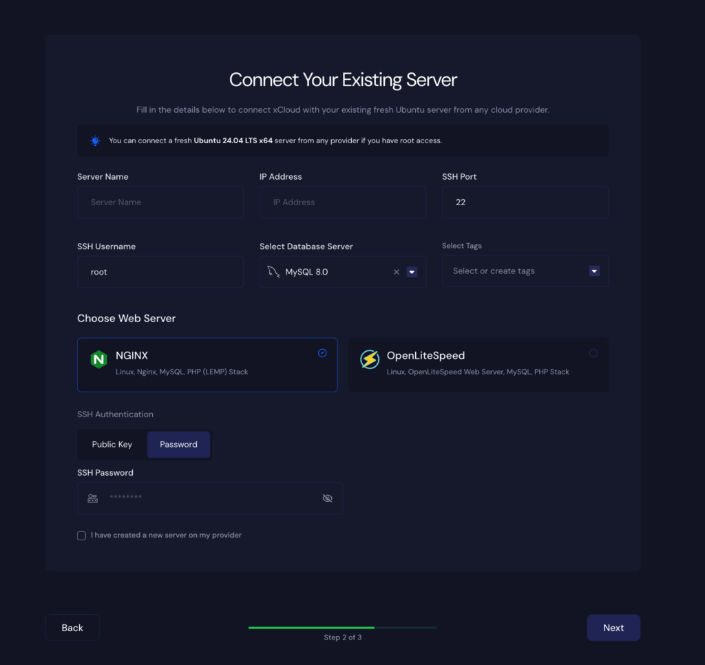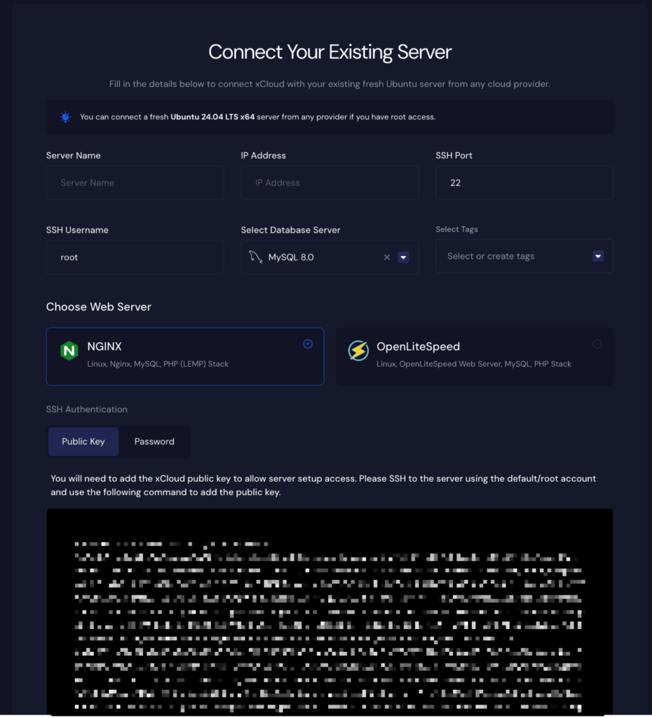 You can now add and connect freshly installed Ubuntu 24.04 LTS x64 servers from any provider to xCloud. Both NGINX and OpenLiteSpeed (OLS) stacks are fully supported on Ubuntu 24.04.