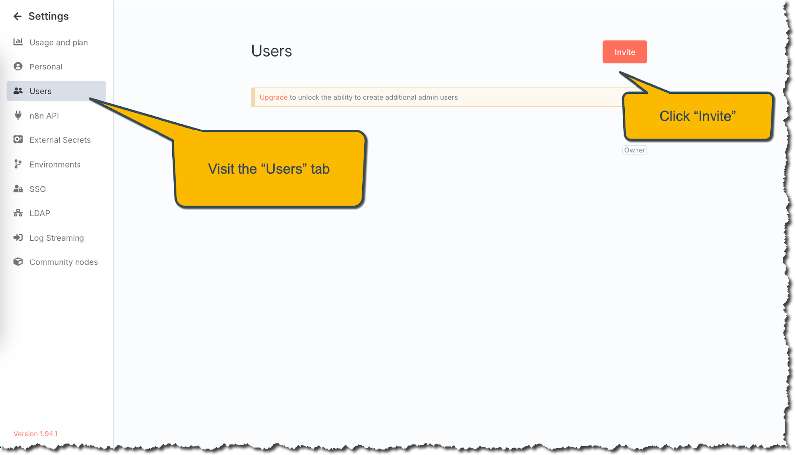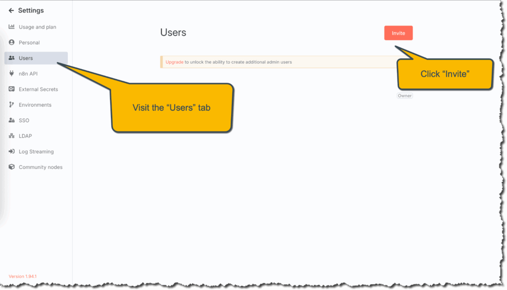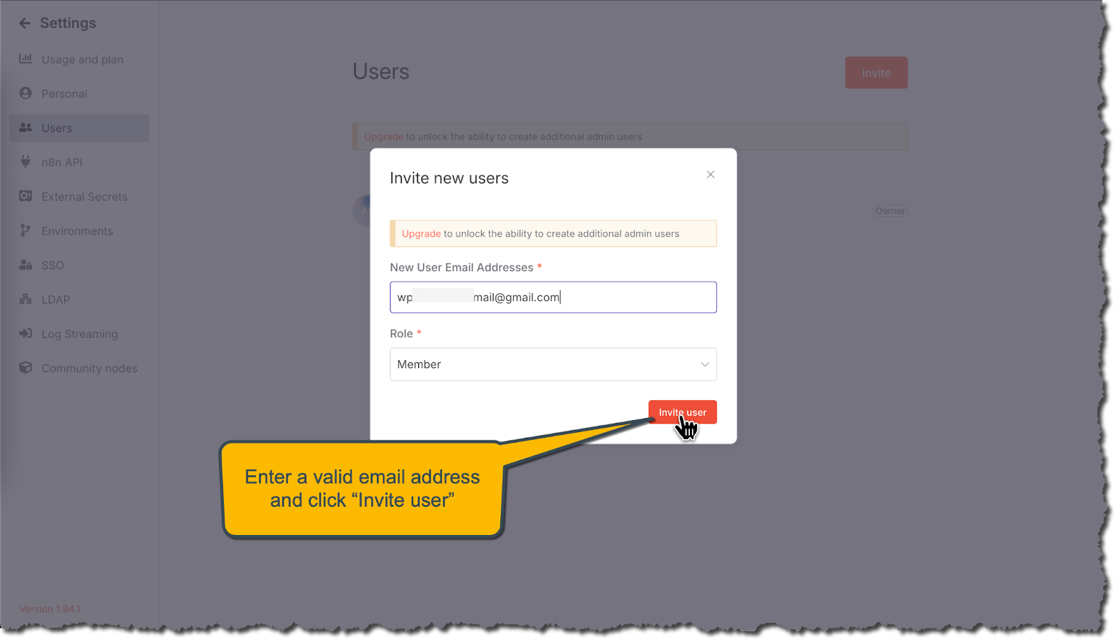 Then go to the Users tab from the sidebar. Click the Invite button to open a pop-up window.