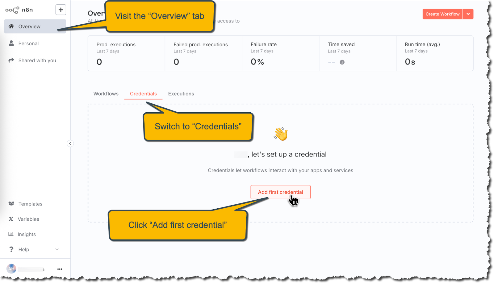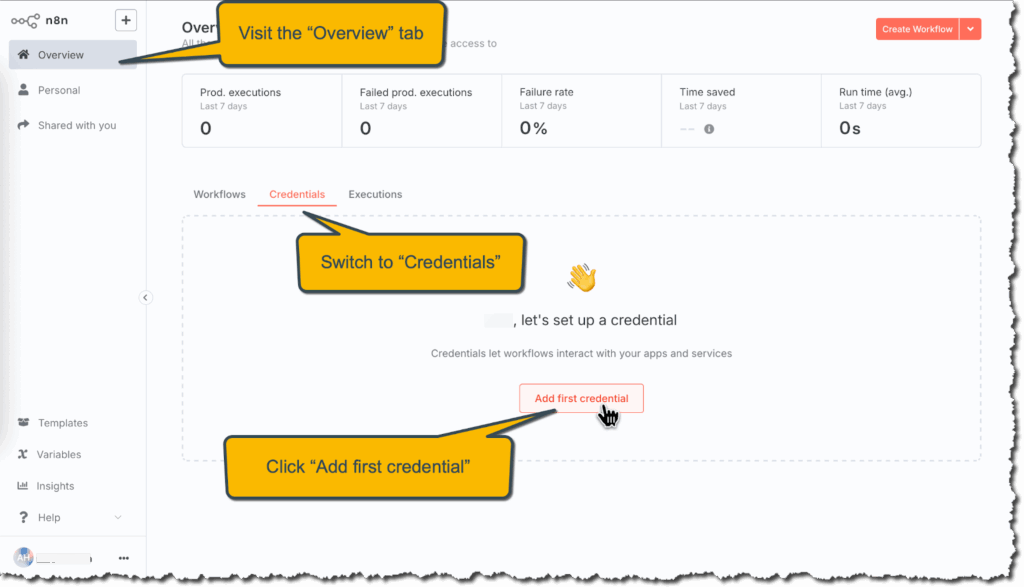 Open the โOverviewโ section from the n8n sidebar. Then go to the โCredentialsโ tab on the dashboard and click โAdd First Credentialsโ.