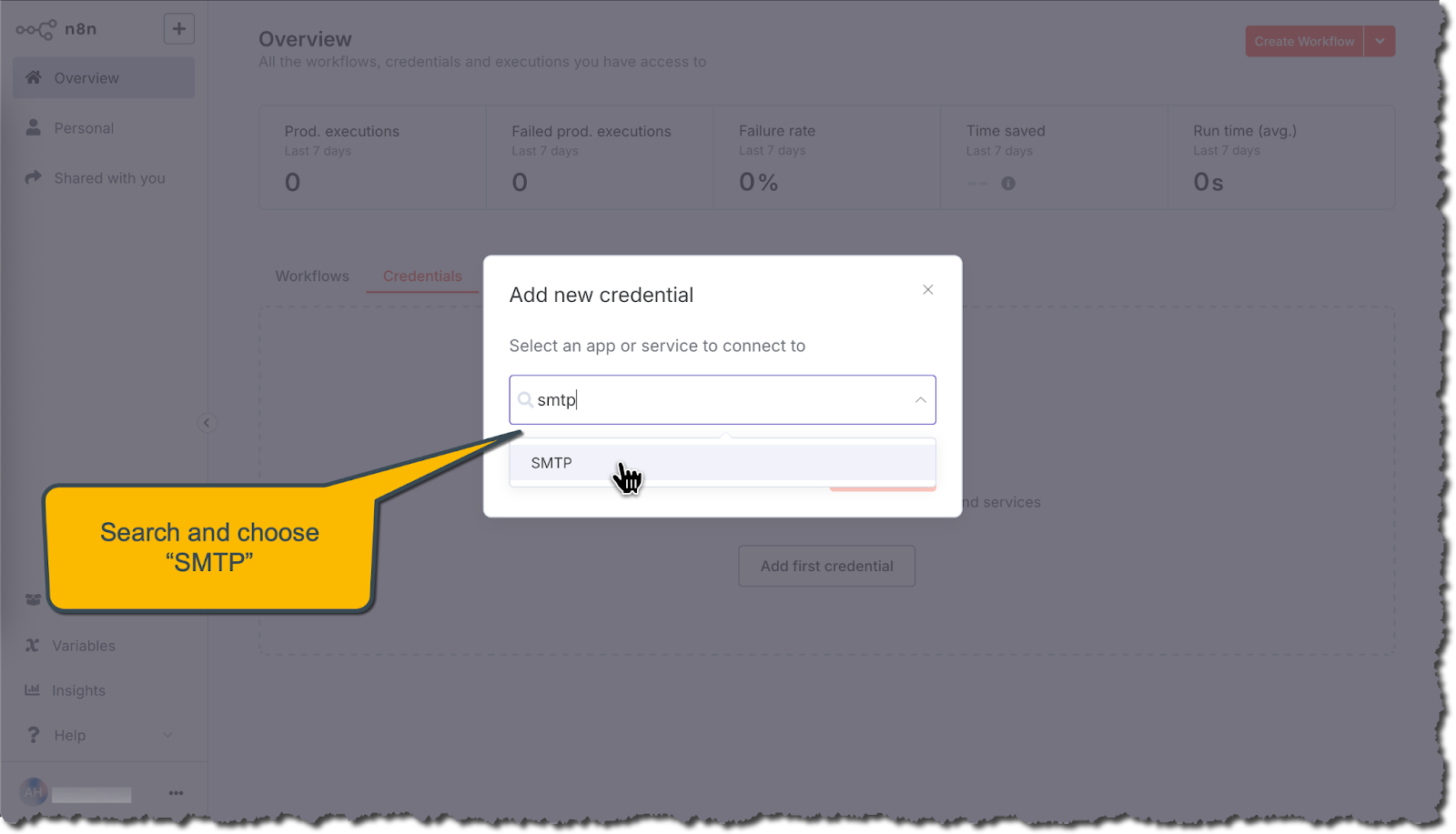 Once you are on the n8n environment, just add the following variables with your SMTP server details: