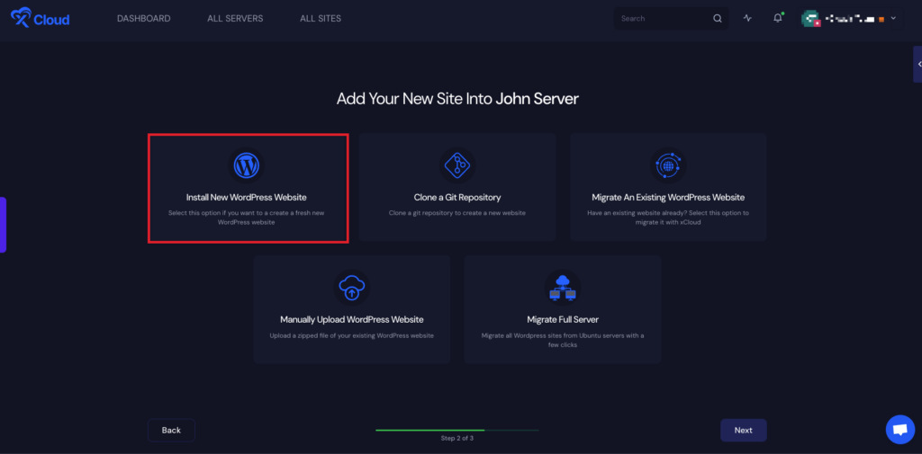 After logging in to your xCloud account, start by adding a new server by clicking on the “Add New Server” button from your dashboard.