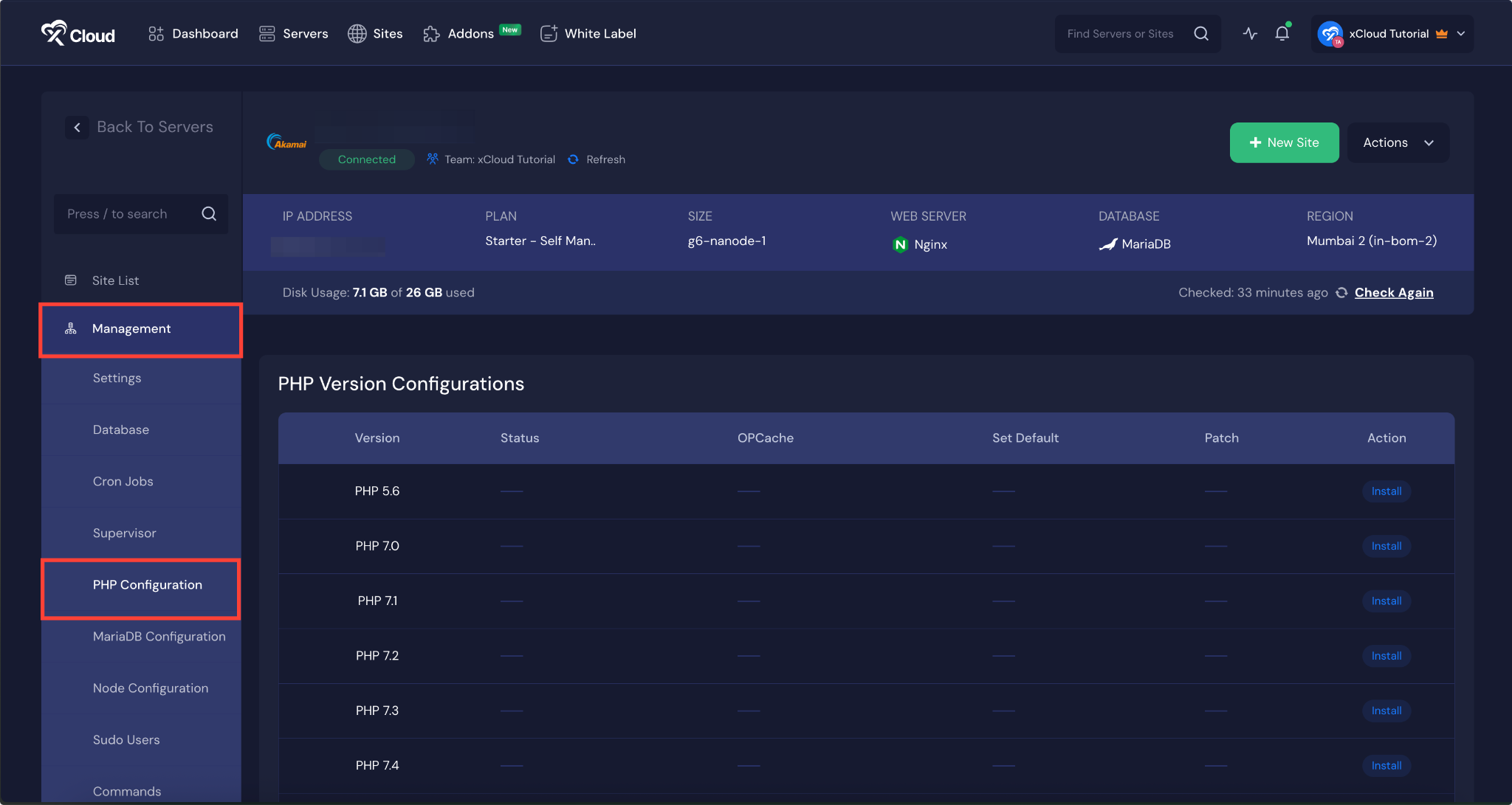 First go to your Server from the xCloud dashboard. Then navigate to the โ€˜Managementโ€™ โ†’ โ€˜PHP Configurationโ€™ to access all the available PHP versions and manage them easily.