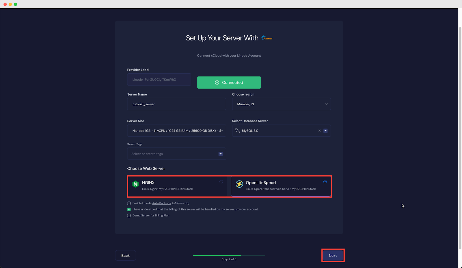 Next, choose the web server stack from โNGINXโ or โOpenLiteSeedโ as your requirements and click on the โNextโ button to proceed with the server creation process.