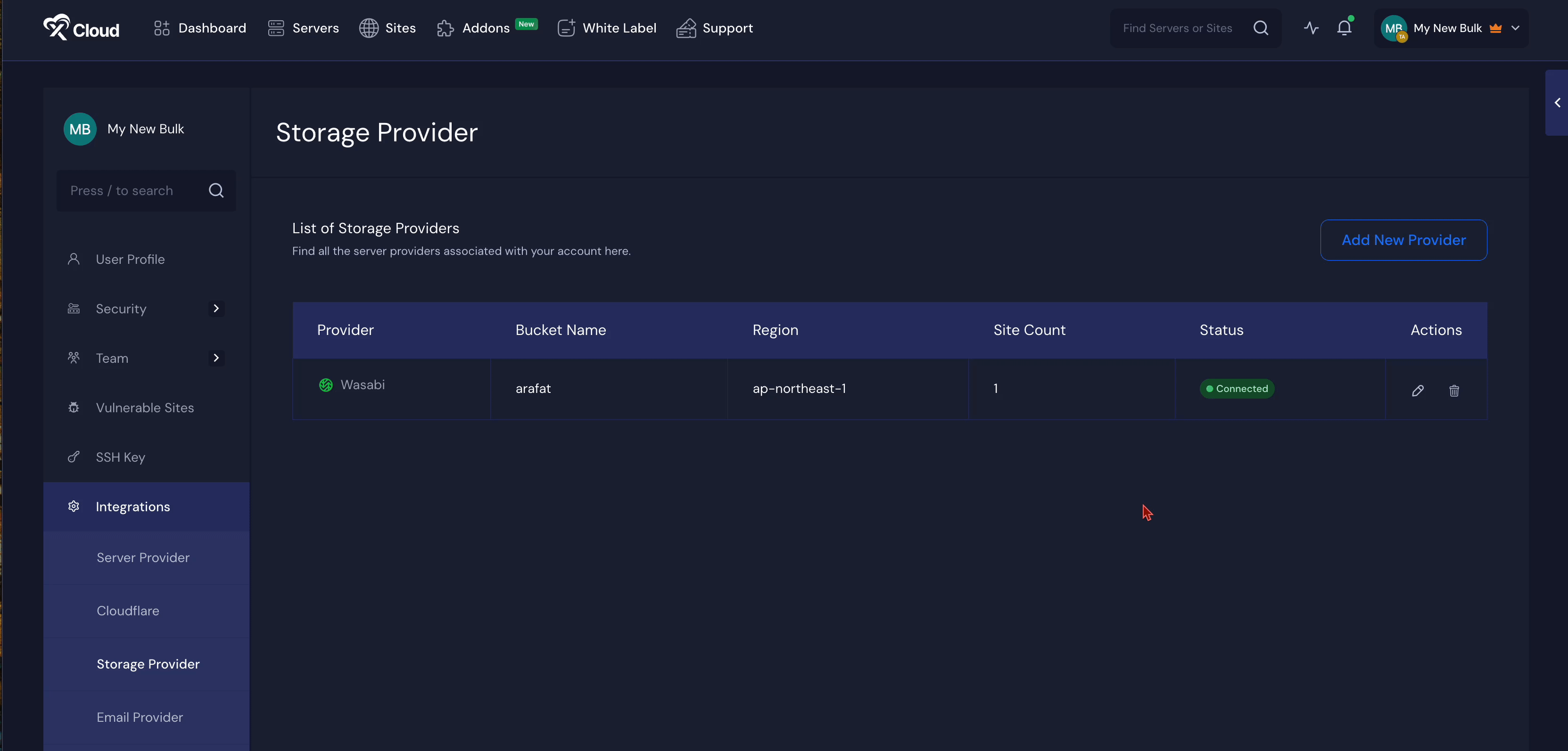 Once you have submitted it, your Wasabi storage will be added to xCloud, you can use it for site backup. Hereโs how it looks in your dashboard once it gets connected successfully.