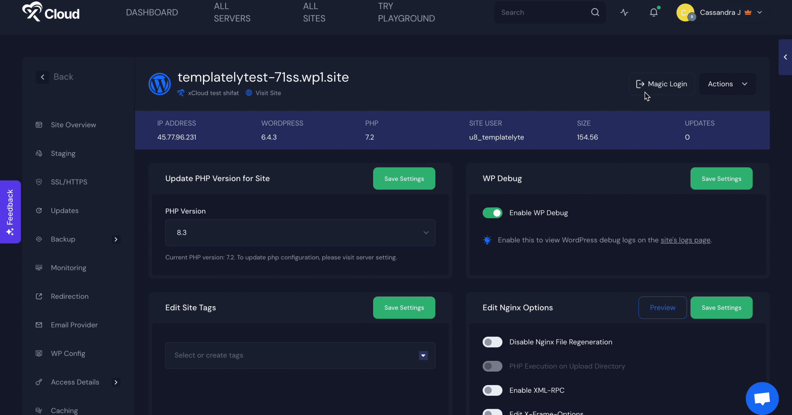 xCloud’s magical login feature simplifies accessing your WordPress admin with a hassle-free process. Say goodbye to password-related concerns and enjoy a more straightforward way to log in. To get started, click the “Magic Login” button. This action triggers the magic login process, and you’ll be securely logged in to your WordPress admin with a single click.