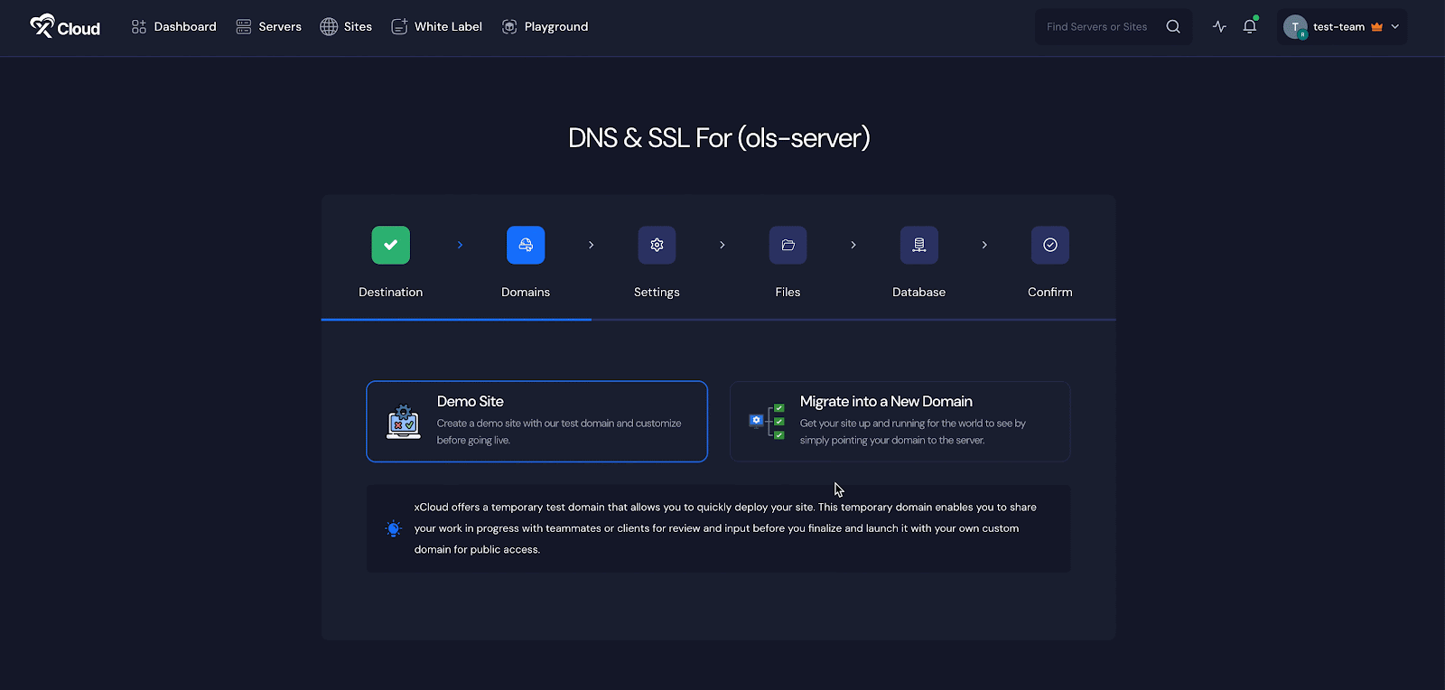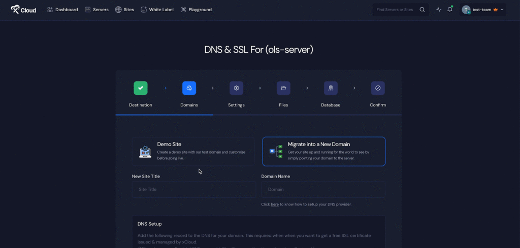 Now, select the โMigrate to a New Domainโ option to deploy your manually uploaded site with a custom domain. Fill in the โSite titleโ, โDomain Nameโ and โDNS Setupโ in the necessary fields and click on the next button to proceed.