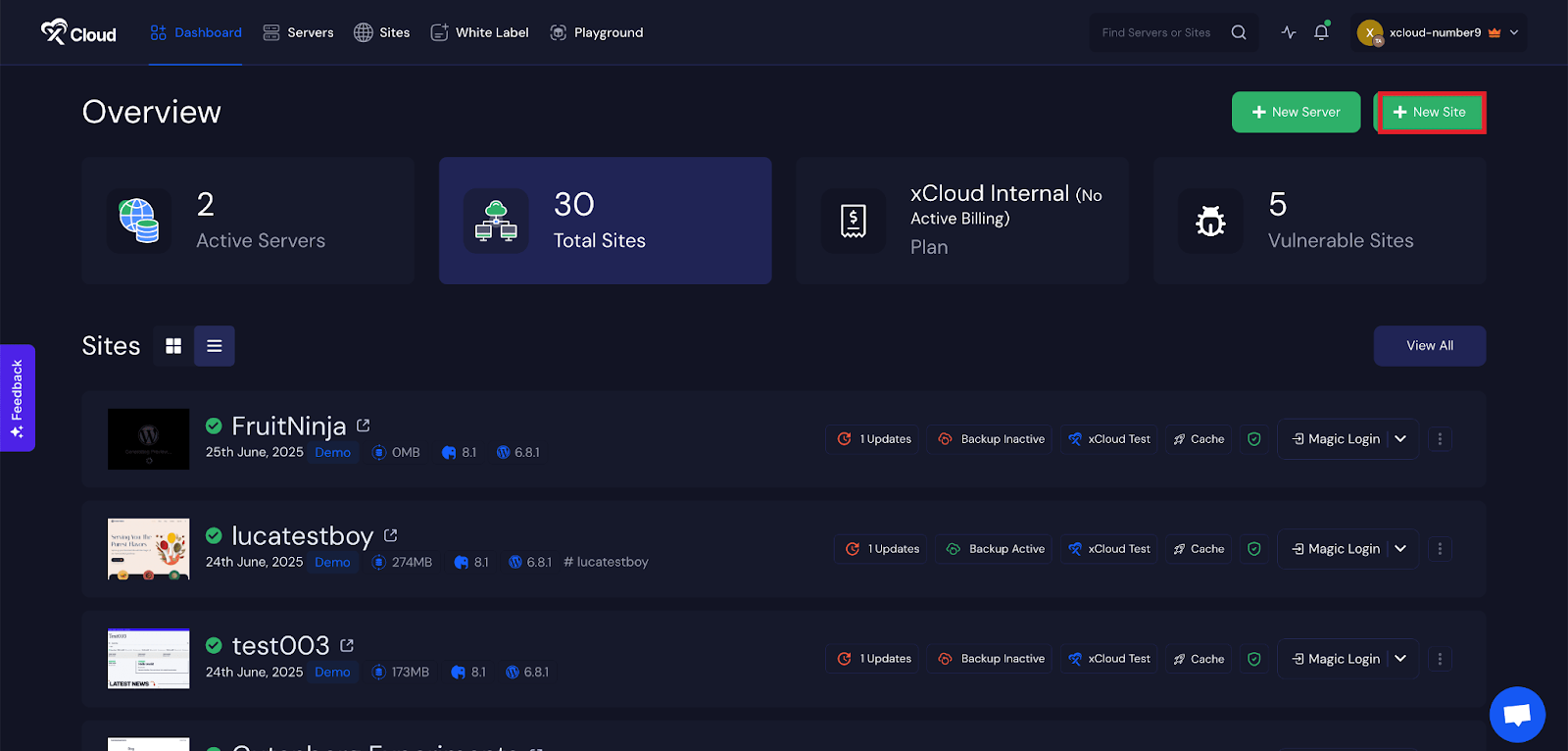 First, you have to log in to xCloud with your credentials. Then click on โNew Siteโ from the xCloud dashboard.