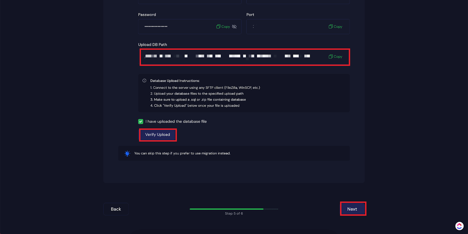 And go back to the xCloud dashboard and click on the check box, if you have uploaded both the site and database, then hit the โVerify Uploadโ button. Then click on the โNextโ button.