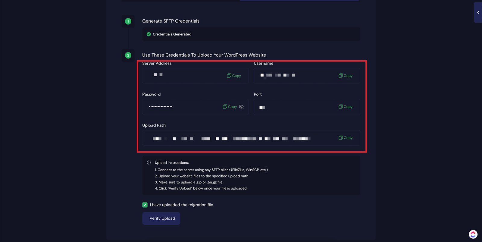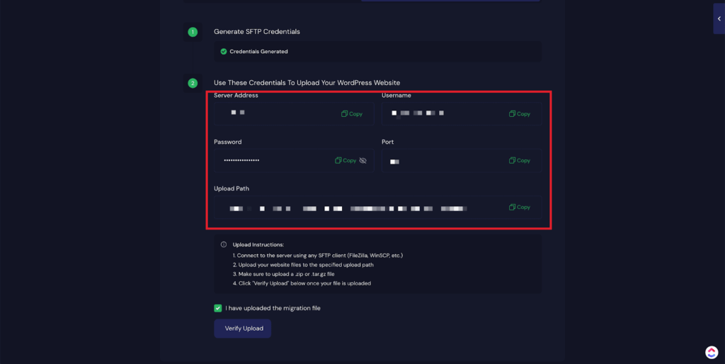 Once the credentials are generated, you will get the โSever Addressโ, โPasswordโ โUsernameโ, โPortโ, โUploaded Pathโ.