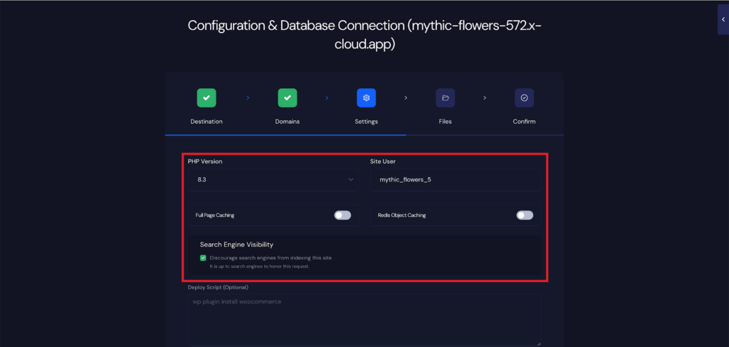 Now, you will be sent to the โSettingsโ step. Make sure to correctly add your โPHP Versionโ, โSite Userโ. Enable or disable the โFull Page Cachingโ, โRedis Object Cachingโ for this site. And if you do not want to index this site in Google then click on the check box to deindex this site.
