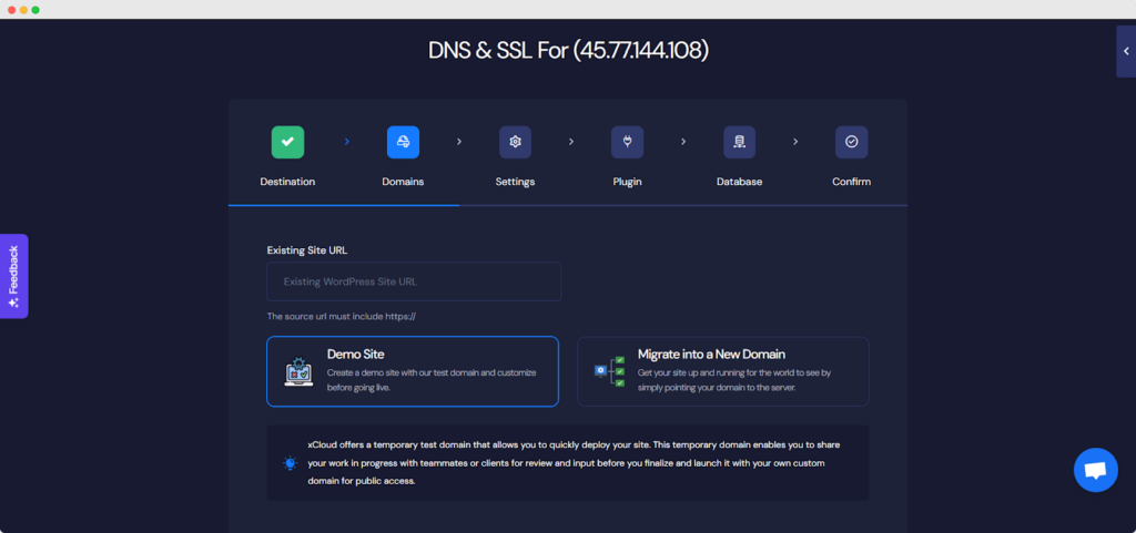 On the domain page, you need to add your source site URL. And if you choose to migrate to a new domain you can include your custom domain. xCloud offers a demo  site environment and with it, you can migrate your site and visit it live with a temporary domain.