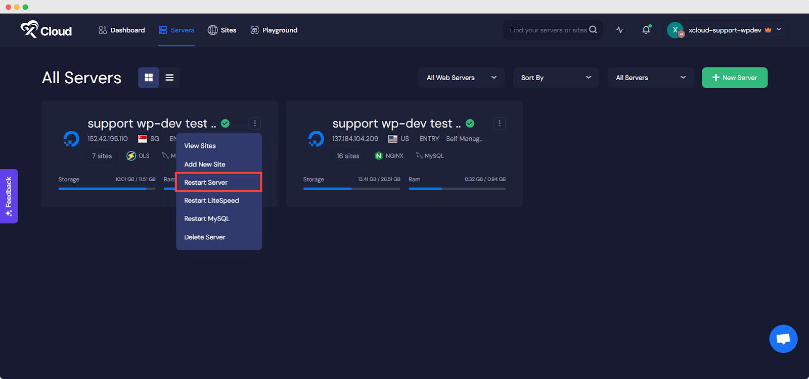 If traffic issues or plugin problems persist, you can reboot the server using the xCloud dashboard. Simply go to the xCloud dashboard, find your server, click the three-dot icon, and select Restart Server.