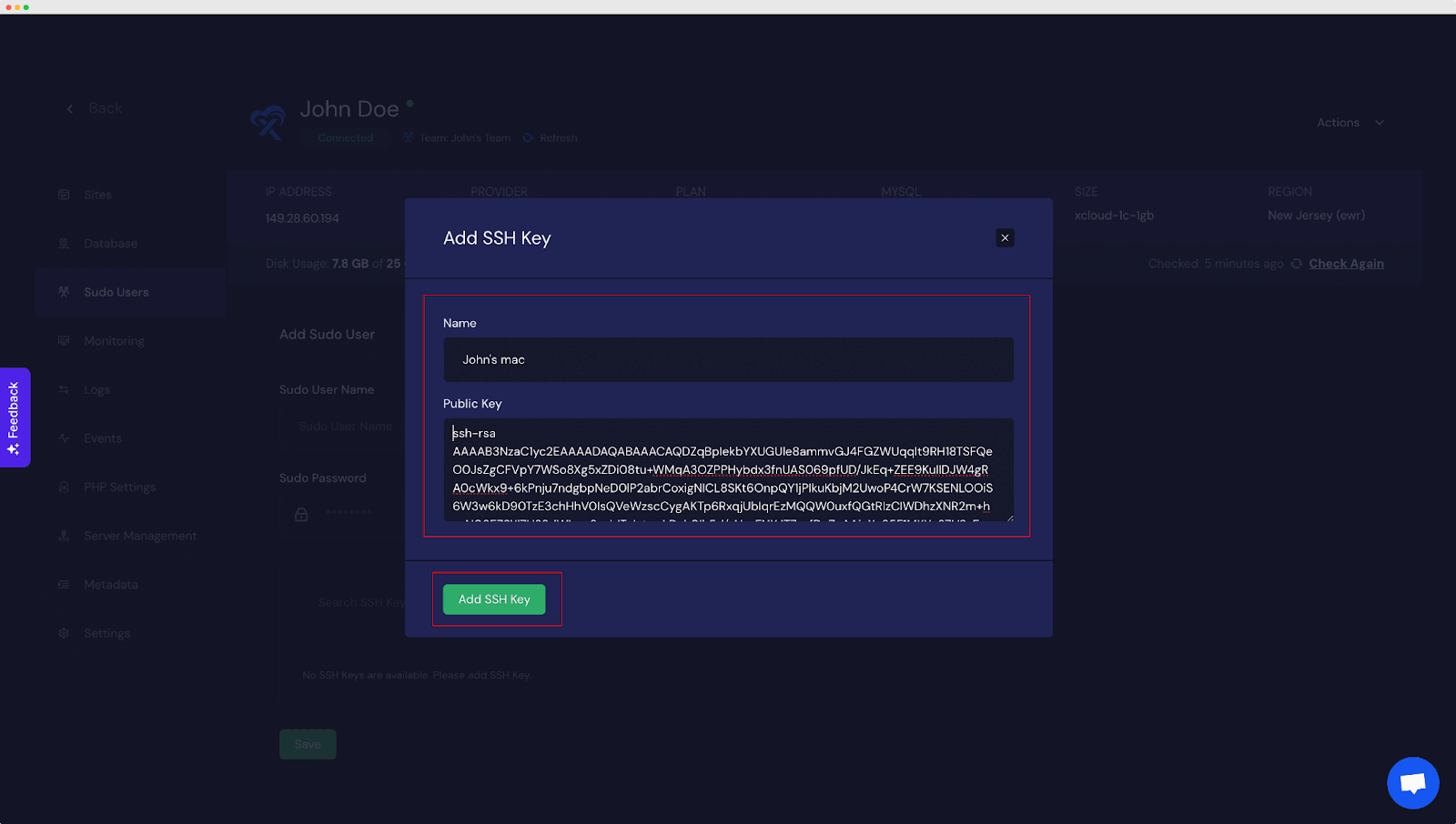 First, you have to create sudo users with sudo access to run commands as the root user, helping you manage the server effectively. To create sudo users and connect your server via SSH, read this documentation: Understanding Sudo Users And Site Users In xCloud.