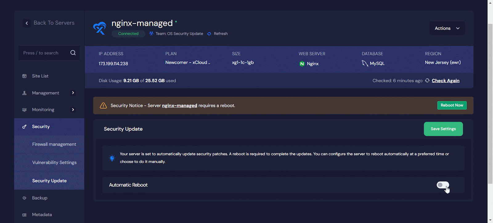 Or click on the Server Name in the notification bar, which will take you to the ‘Server Update’ section under the Security settings. From there, you can also click ‘Reboot Now’ to update the server immediately.