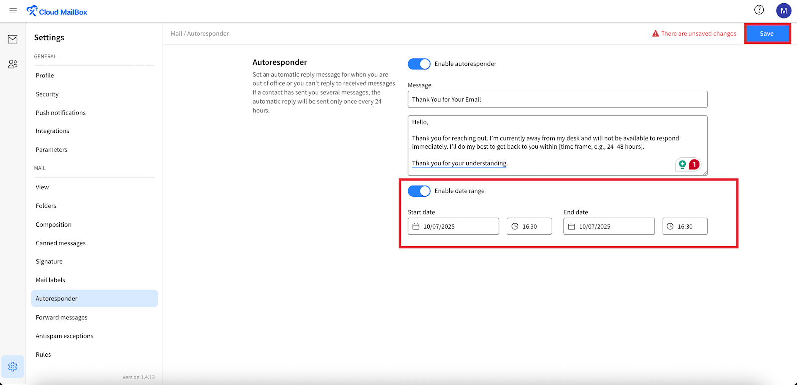 Then, enable the โDate Rangeโ button if you want to set it for a certain timeframe. Choose a โStart Dateโ, โStart Timeโ, โEnd Date โ andโ End Timeโ of this email and hit on the โSaveโ button.