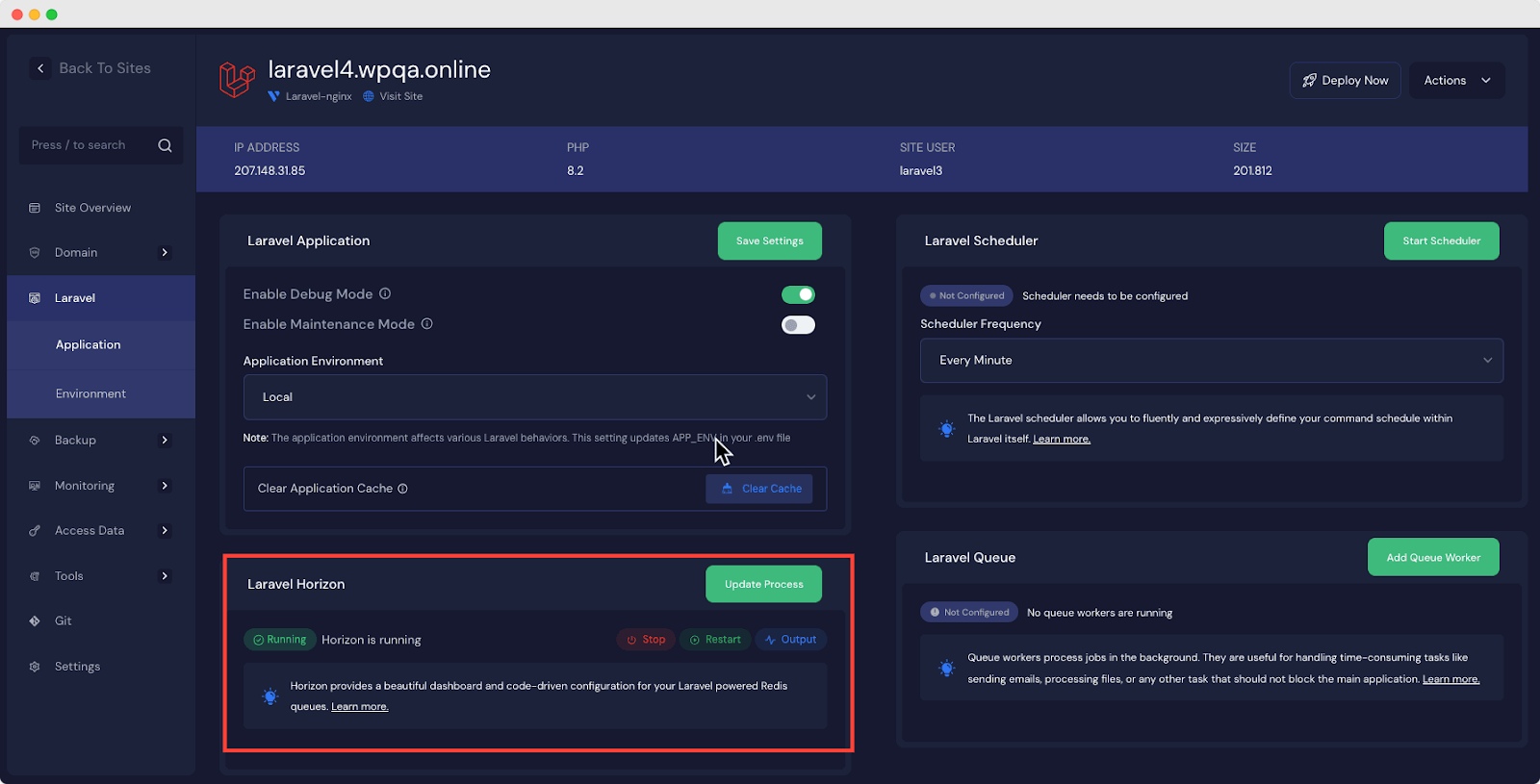 First, go to your site and navigate to the ‘Laravel’ section in the dashboard. Select your ‘Application’ from the list of deployed Laravel applications.